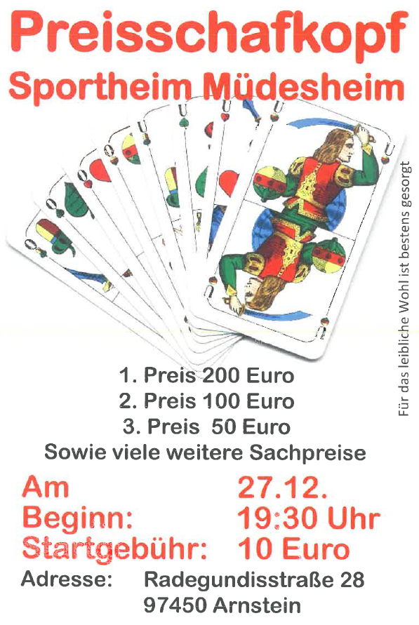 Am 1. Freitag des Monats findet ab 20 Uhr ein Schafkopftreff im Sportheim statt. Alle Interessenten sind herzlich willkommen - ganz gleich, ob Anfänger oder erfahrener Spieler.